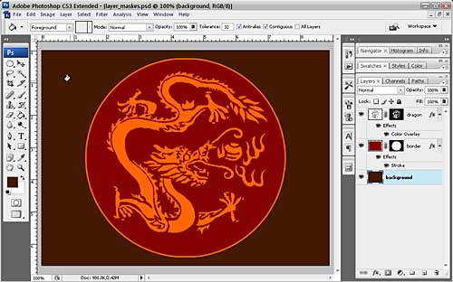 Now we will edit parts of the mask. Choose the magic wand again and select the dragons nose.With the layer mask selected, select the paint brush in the tools panel. (See illustration to the right)
