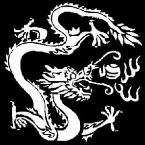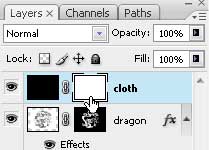 With the dragon selected, click the "Add Layer Mask" button at the bottom of the layers panel.(See illustration to the left) Masking the image will appear to erase everything around the image. In fact it is "masking" or making those areas hidden. By selecting the paint brush , you can add to the mask using white or subtract from the mask using black. The layer mask only works in "gray scale." That means no color can be added to the layer mask.