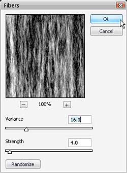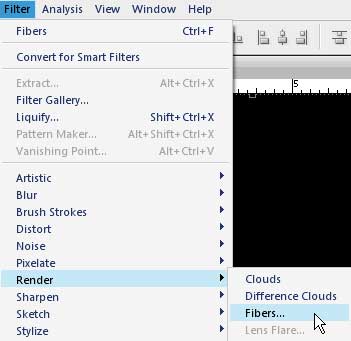 Select the layer mask and go to Filter/Render/Fibers. When you select Fibers, the Fibers dialogue box should appear.