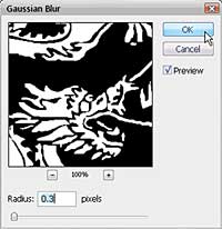 Layer masks are also great for using filters on. To use a filter on the mask, Make sure you have the Layer mask selected and not the image, and go to Filter/Blur/Gaussian Blur. In the Gaussian Blur filter dialogue box, set the Radius to 0.3 pixels. (See illustration to the left)