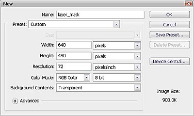 Set the size to 640X480, Resolution 72, RGB color mode, and a transparent background. These settings are ideal for the web environment. (See illustration to the left)