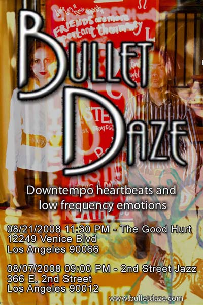 This is a Flyer for a music group Bullet Daze. Michelle Koterba from Bullet Daze asked me to create this Flyer from several images of their band for a Bullet Daze performance in Los Angeles.